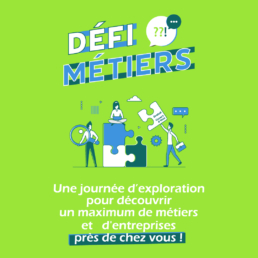 Défi Métiers c’est 3 journées dédiées à la découverte des entreprises et des métiers ; dont 1 journée d’exploration, durant laquelle les participants découvriront les entreprises locales, en petits groupes. Les participants iront spontanément à la rencontre des entreprises pour y recueillir des informations sur les métiers exercés, sur le fonctionnement de ces entreprises, et sur les éventuelles opportunités d’emploi.